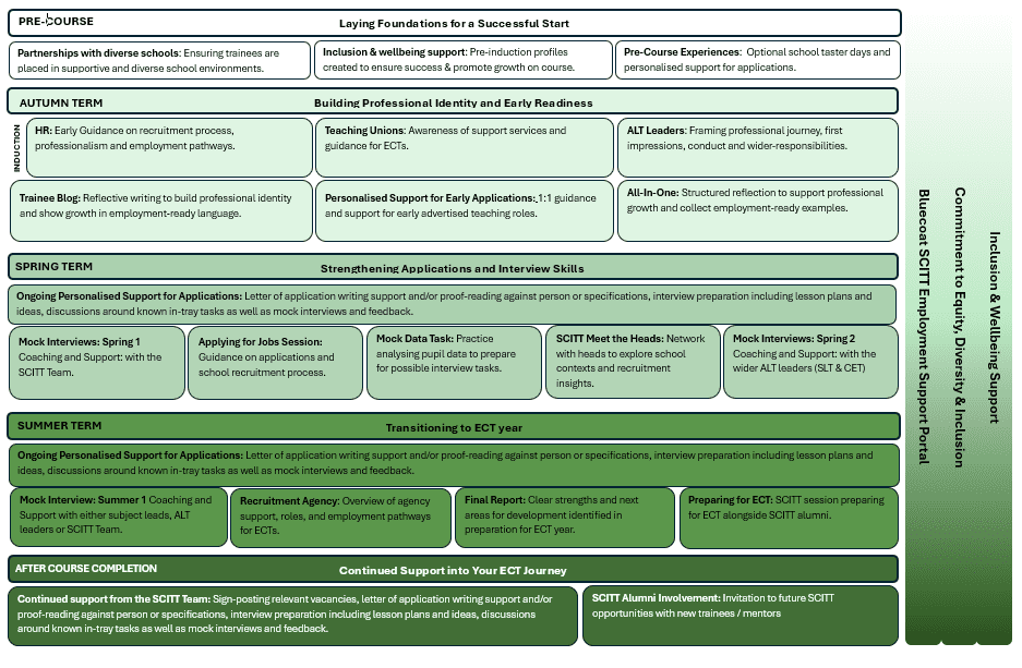 Our commitment to our trainee teachers does not end when they finish their teacher training year. Our commitment extends into your life long teaching career. We continue to support you as an Early Career Teacher, and have a professional development programme, and continue our open door policy to offer support and advice in the early years of teaching. We have an Alumni which enables us to share experiences and practice, and invite our ex trainees to come back and talk to new trainees.